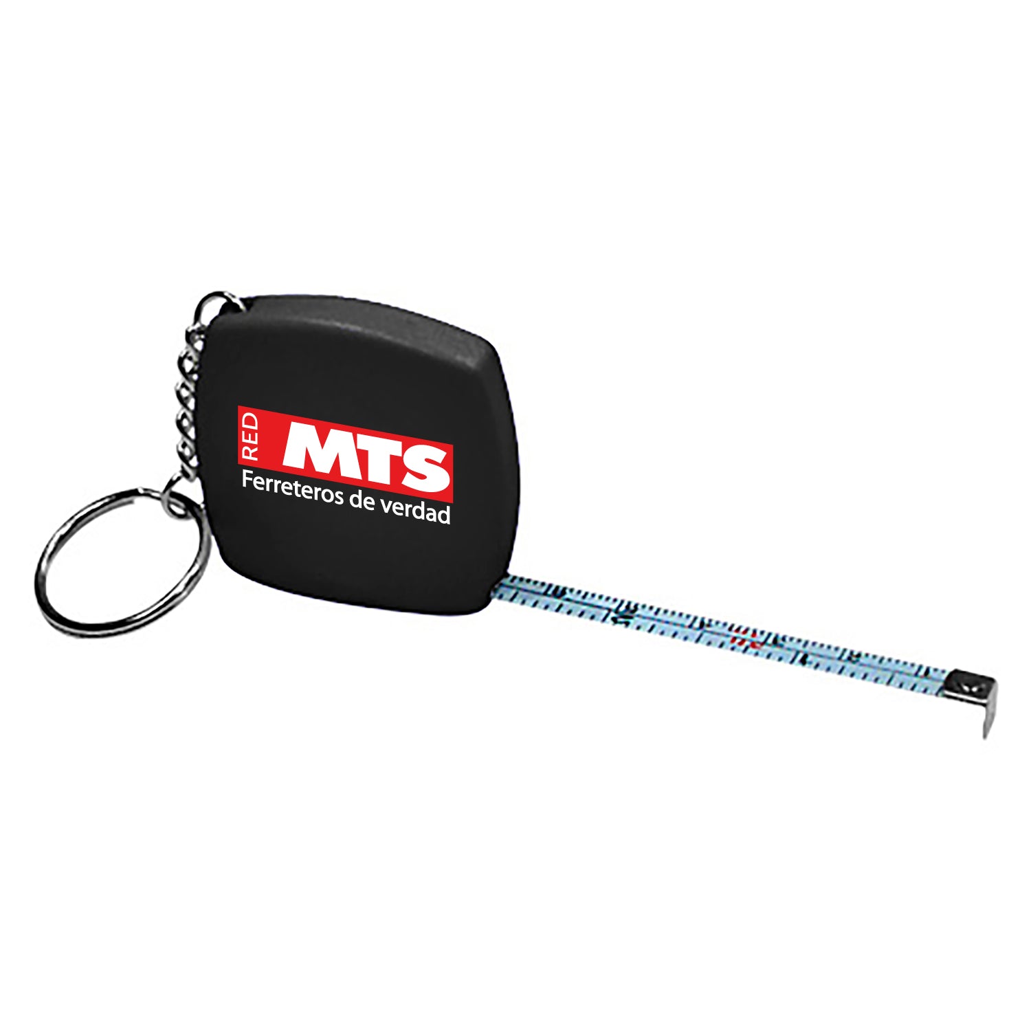 Llavero con huincha de medir retráctil de tamaño compacto.